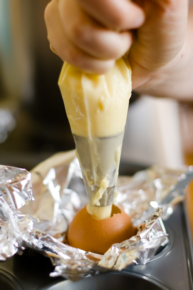 Load the batter into a piping bag fitted with a large round tip. Make sure that the tip can fit all of the way inside of the egg hole. If it can't, expand the hole a little bit at a time until it fits. Fill your eggs about 3/4 full with batter. This is the tricky part. If you underfill the eggs, you won't have a complete cake egg inside when you crack them after baking. If you overfill the eggs, cake will overflow out of the egg during baking.