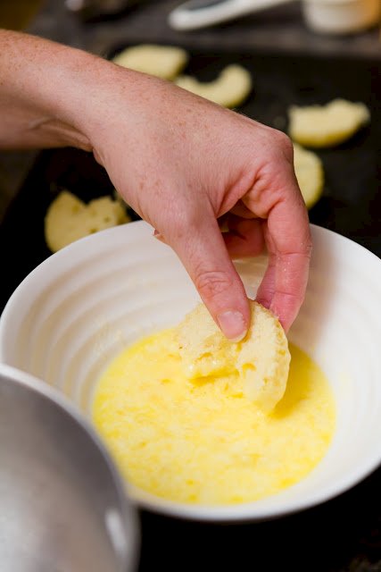 - While the oil is heating, prepare your cupcake pieces for frying. Those of you who have made fried chicken may be familiar with this method. Pick one hand to be your wet hand and one hand to be your dry hand. With your wet hand, pick up a cupcake piece and dunk it in the egg/buttermilk mixture. Make sure it’s completely covered and then lift it out and shake off any excess liquid.