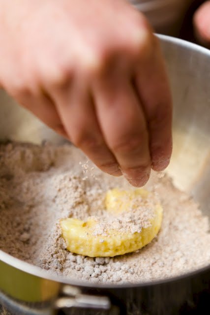 - Still using the wet hand, drop the cupcake piece into the bowl filled with the “breading.” Use the dry hand to pick up breading and cover the wet cupcake piece with it. Make sure the entire cupcake piece is covered. Place the “breaded” cupcake piece onto a plate and repeat the dipping and “breading” with all pieces.